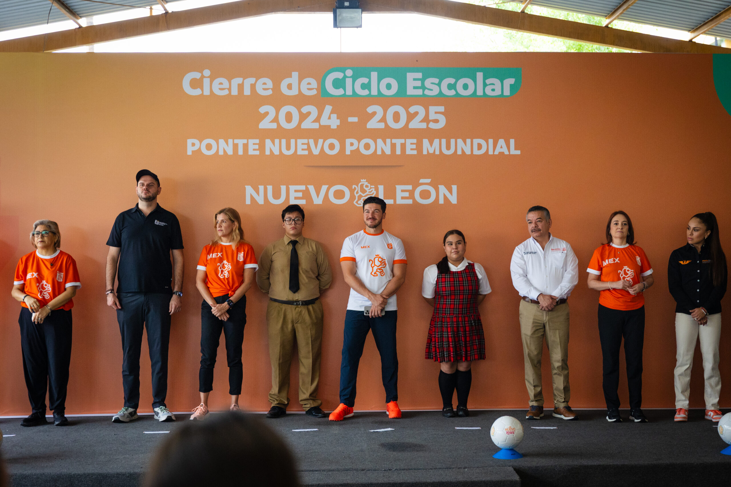 Monterrey, Nuevo León.- A ritmo del Mundialito, el Gobernador del Estado, encabezó la ceremonia de cierre del Ciclo Escolar 2024-2025, en el que más de un millón 56 mil alumnas y alumnos de Educación Básica concluyeron sus clases.