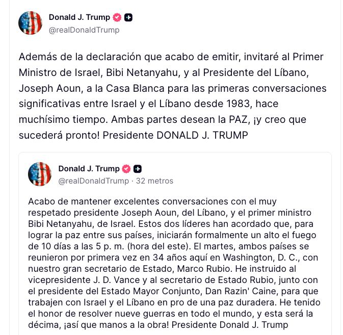 «Acabo de mantener excelentes conversaciones con el muy respetado presidente Joseph Aoun, del Líbano, y con el primer ministro Bibi Netanyahu, de Israel. Estos dos líderes han acordado que, para lograr la PAZ entre sus países, iniciarán formalmente un alto el fuego de 10 días a las 5:00 p.m. EST», escribió Trump en su red Truth Social.