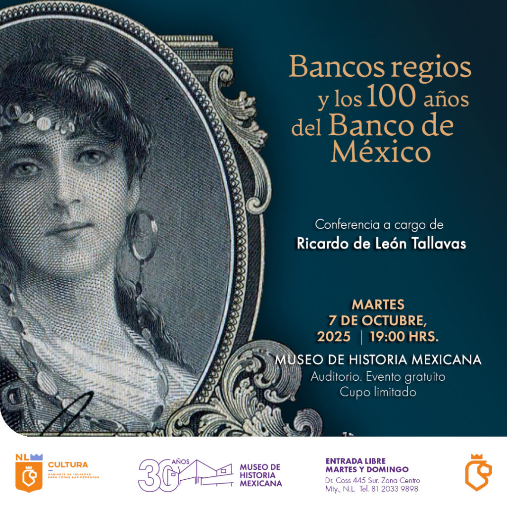 Nuevo León.- El Museo de Historia Mexicana invita a la conferencia “Bancos regios y los 100 años del Banco de México”, que ofrecerá el especialista en numismática Ricardo de León Tallavas, el martes 7 de octubre a las 19:00 horas en el auditorio del museo.