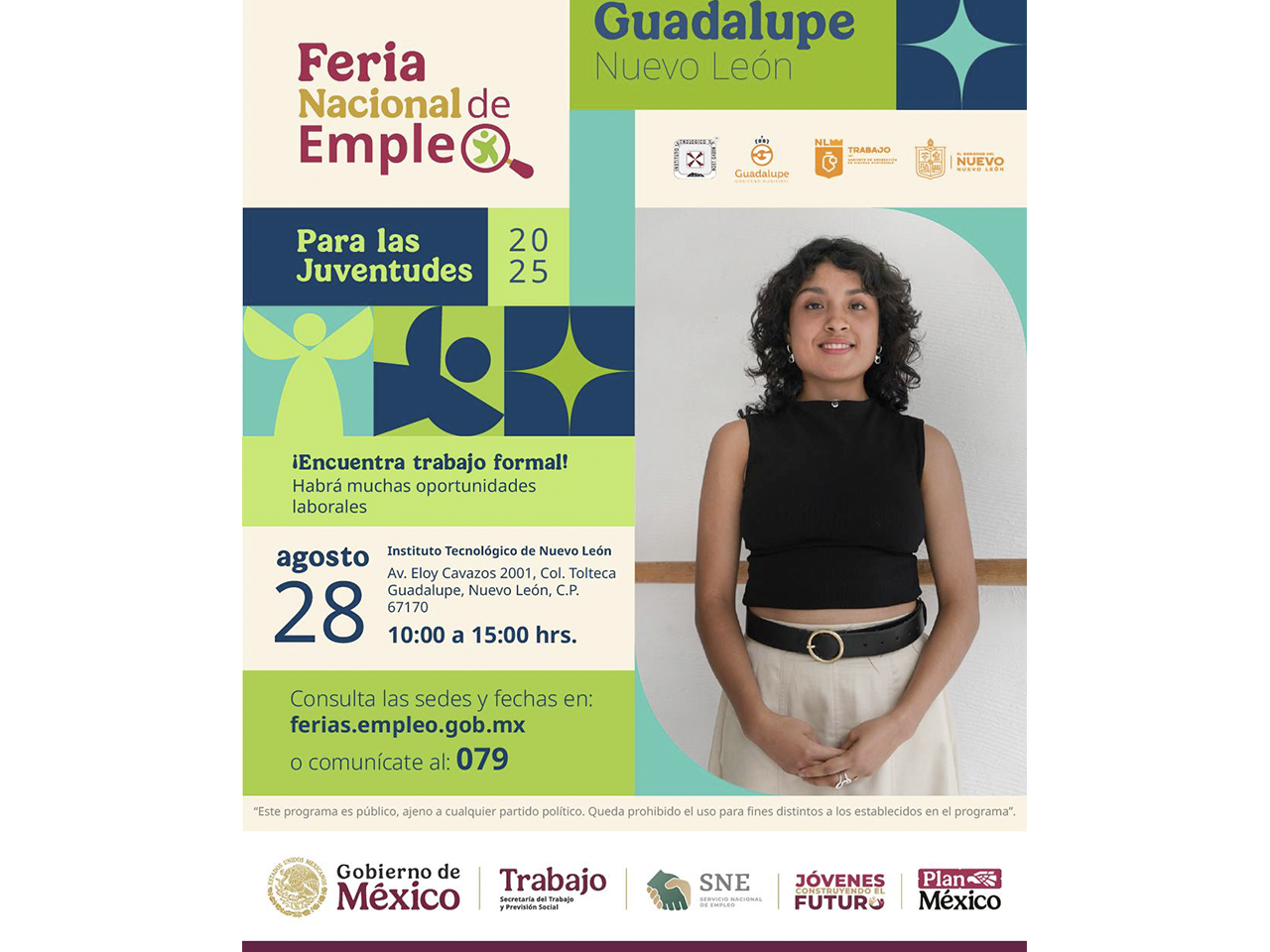 Guadalupe, Nuevo León.- Para agilizar e incrementar una vinculación directa de los buscadores de empleo con las empresas, el Gobierno del Estado a través de la Secretaría del Trabajo y con el apoyo del Gobierno Federal, llevará a cabo la Feria Nacional de Empleo para las Juventudes 2025 en el municipio de Guadalupe.