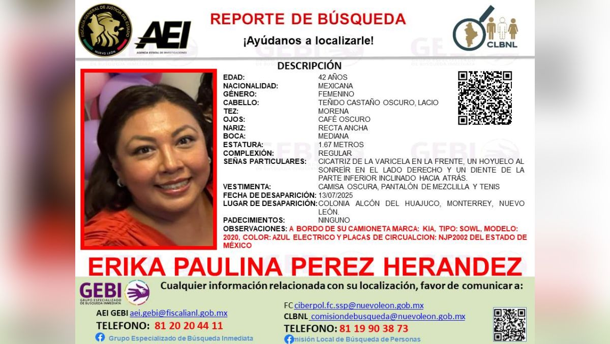 Se trata de Erika Paulina Pérez Hernández, de 42 años, y Nidia Martínez Moreno, quienes fueron vistas por última vez el pasado 13 de julio en la colonia Ancón del Huajuco, en el municipio de Monterrey.