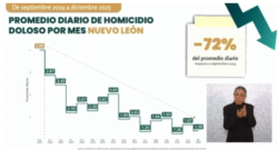 Nuevo León.- De septiembre de 2024 a diciembre de 2025, el promedio diario de homicidios dolosos en Nuevo León disminuyó 72 por ciento, al pasar de 5 casos a 1.39 en ese periodo, informó Marcela Figueroa Franco, titular del Secretariado Ejecutivo del Sistema Nacional de Seguridad Pública (SESNSP).