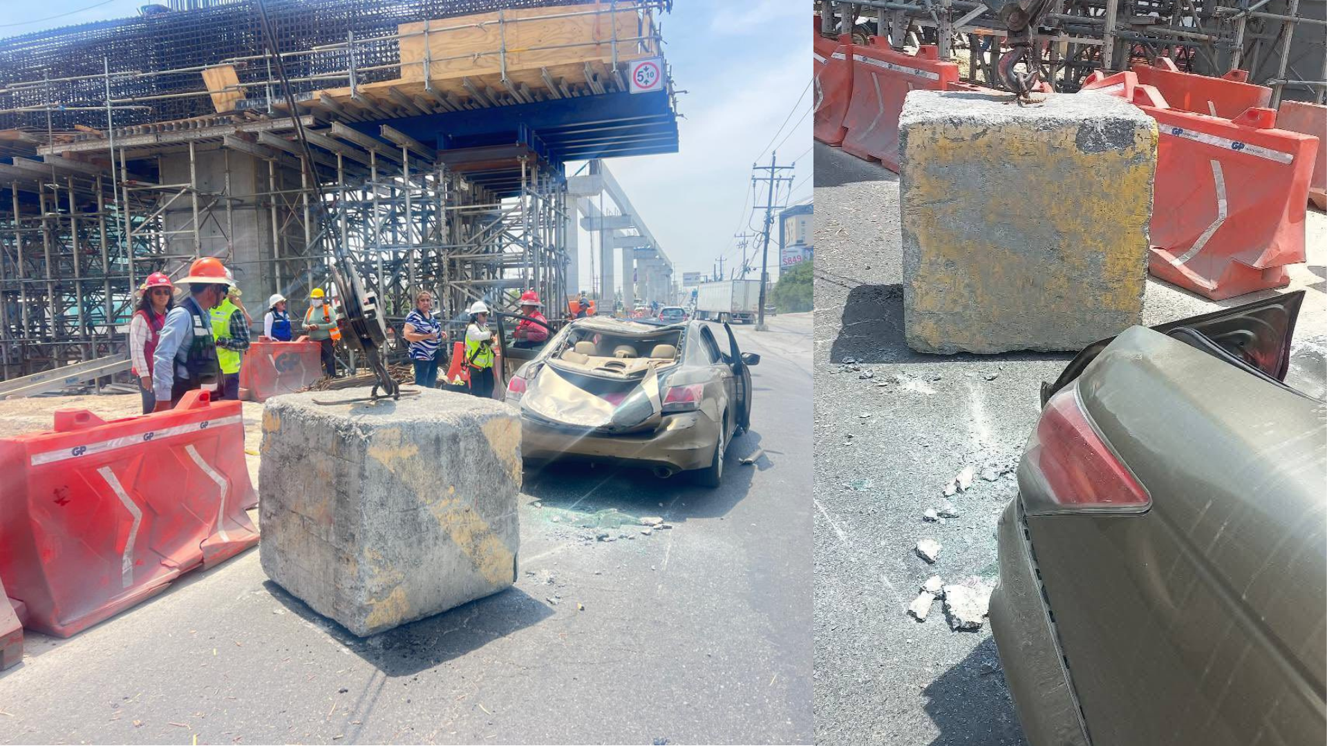 Apodaca, Nuevo León.- Un bloque de concreto proveniente de las obras del Metro cayó sobre un vehículo en circulación, dejando a una persona lesionada, luego de una falla mecánica en una grúa durante maniobras de izaje.