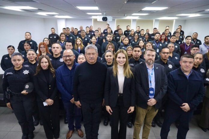 La presidenta del DIF, Gaby Oyervides, junto con Ignacio López Vergara, jefe de la Oficina de UNICEF México, encabezaron el arranque de esta capacitación dirigida a elementos, entre operadores y policías primeros respondientes.