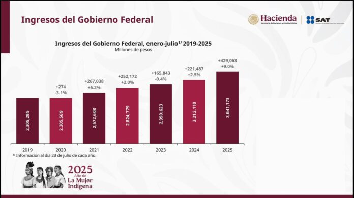 México.-En conferencia matutina, la Presidenta de México, celebró que a julio de 2025 se registre un récord en los ingresos del Gobierno Federal con la recaudación de impuestos.
