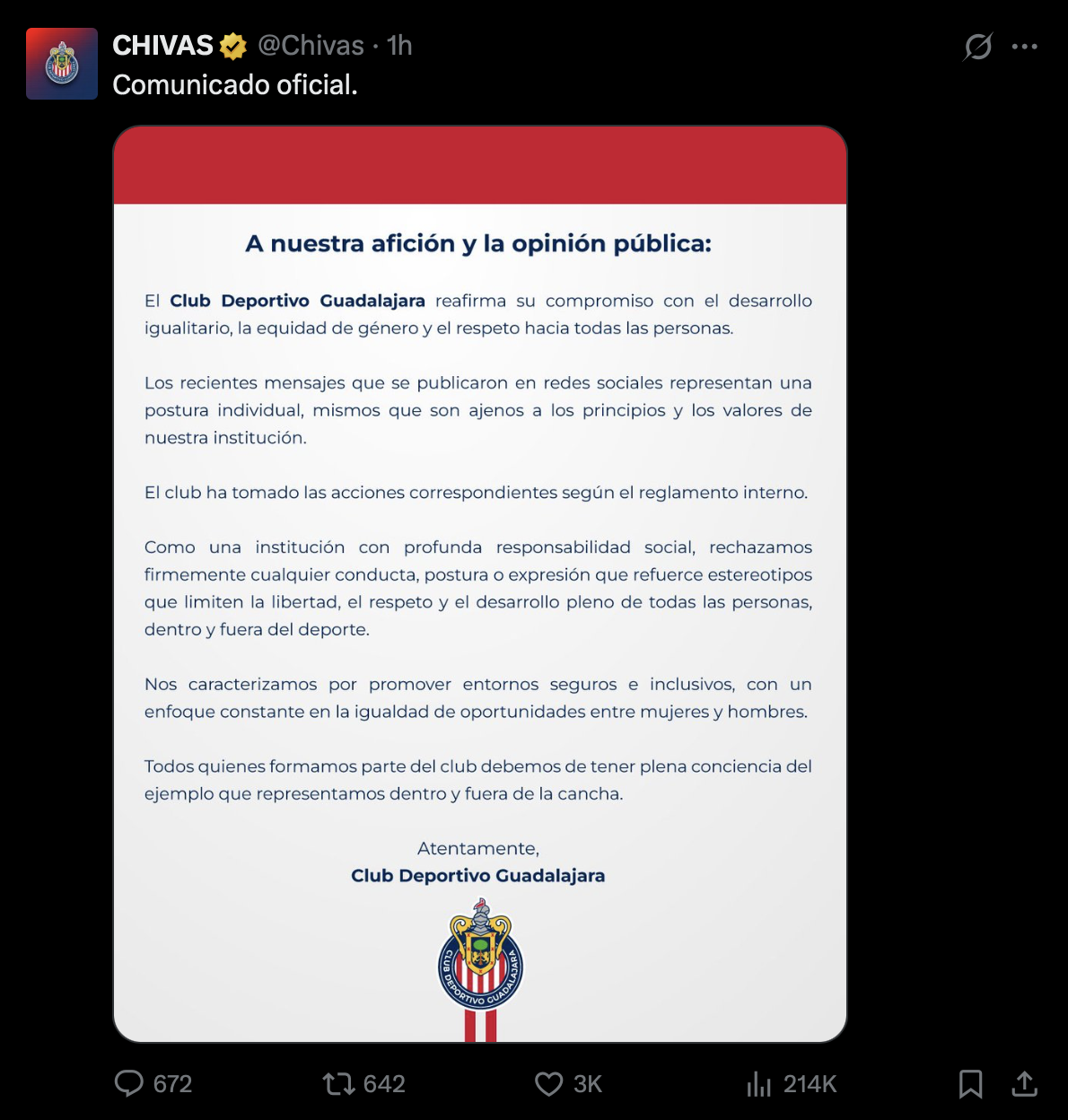 A través de un comunicado, la institución dejó claro que dichas opiniones no representan los valores del club, y afirmó que ya se tomaron las medidas correspondientes conforme al reglamento interno.