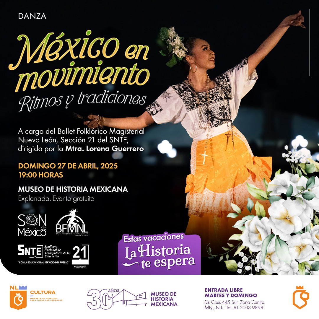 “Son de México. México en movimiento: ritmos y tradiciones” unirá la rica tradición dancística de los estados de Tabasco, Yucatán y Campeche, Sonora, Aguascalientes y Zacatecas, en el cierre de las actividades de las vacaciones de primavera “La Historia te espera” en la explanada del Museo de Historia Mexicana el domingo 27 de abril a partir de las 19:00 horas.