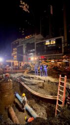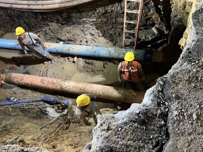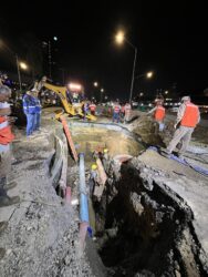 Esta fuga provocó el colapso del pozo de visita y de la red de drenaje sanitario, personal de Agua y Drenaje de Monterrey acudió a la zona para reparar la fuga.