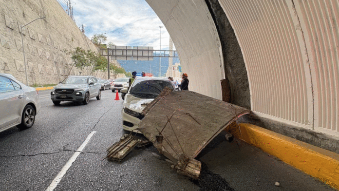 San Pedro Garza García, N.L.— Un conductor resultó ileso luego de que un tramo de pared colapsara y cayera sobre su vehículo al interior del Túnel de la Loma Larga, en dirección hacia el municipio de Monterrey.