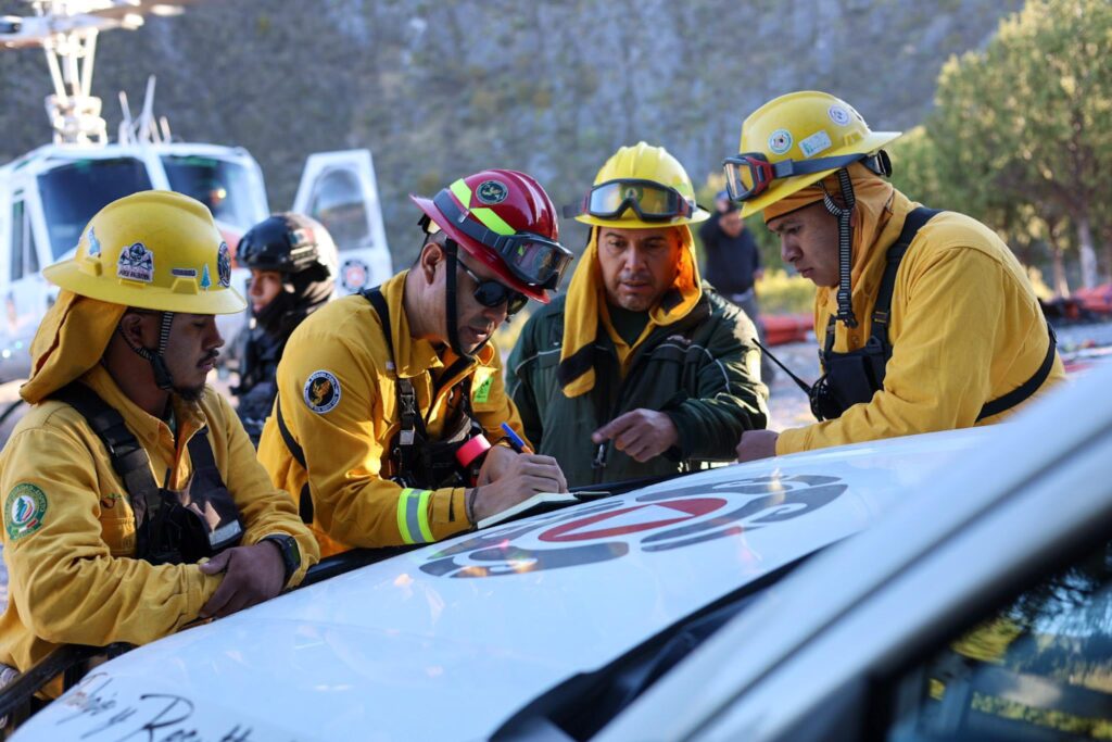 Galeana, Nuevo León.-Elementos de Protección Civil Nuevo León atienden un incendio forestal ubicado a media ladera del cerro, con propagación en diferentes direcciones.