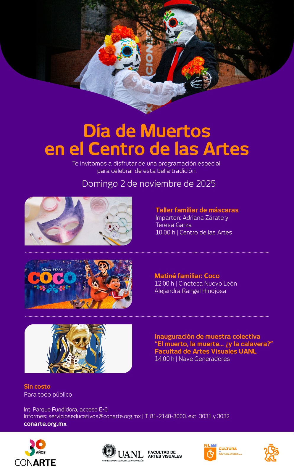 En el Centro de las Artes, el sábado a partir de las 10:00 horas se realizará el taller familiar de máscaras, dirigido por Adriana Zárate y Teresa Garza. A las 12:00 horas, en la Cineteca Nuevo León “Alejandra Rangel Hinojosa”, se proyectará la función especial Matiné familiar: Coco.