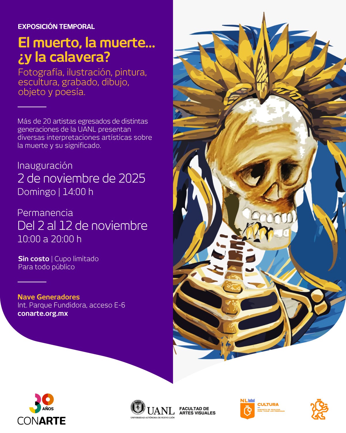 Por la tarde, a las 14:00 horas en la Nave Generadores, abrirá la exposición temporal “El muerto, la muerte… ¿y la calavera?”, una muestra colectiva que reúne fotografía, ilustración, pintura, escultura, grabado, dibujo, objeto y poesía. La exhibición reúne a más de 20 artistas egresados de la Facultad de Artes Visuales de la UANL y estará abierta al público hasta el 12 de noviembre, de martes a domingo de 10:00 a 20:00 horas.