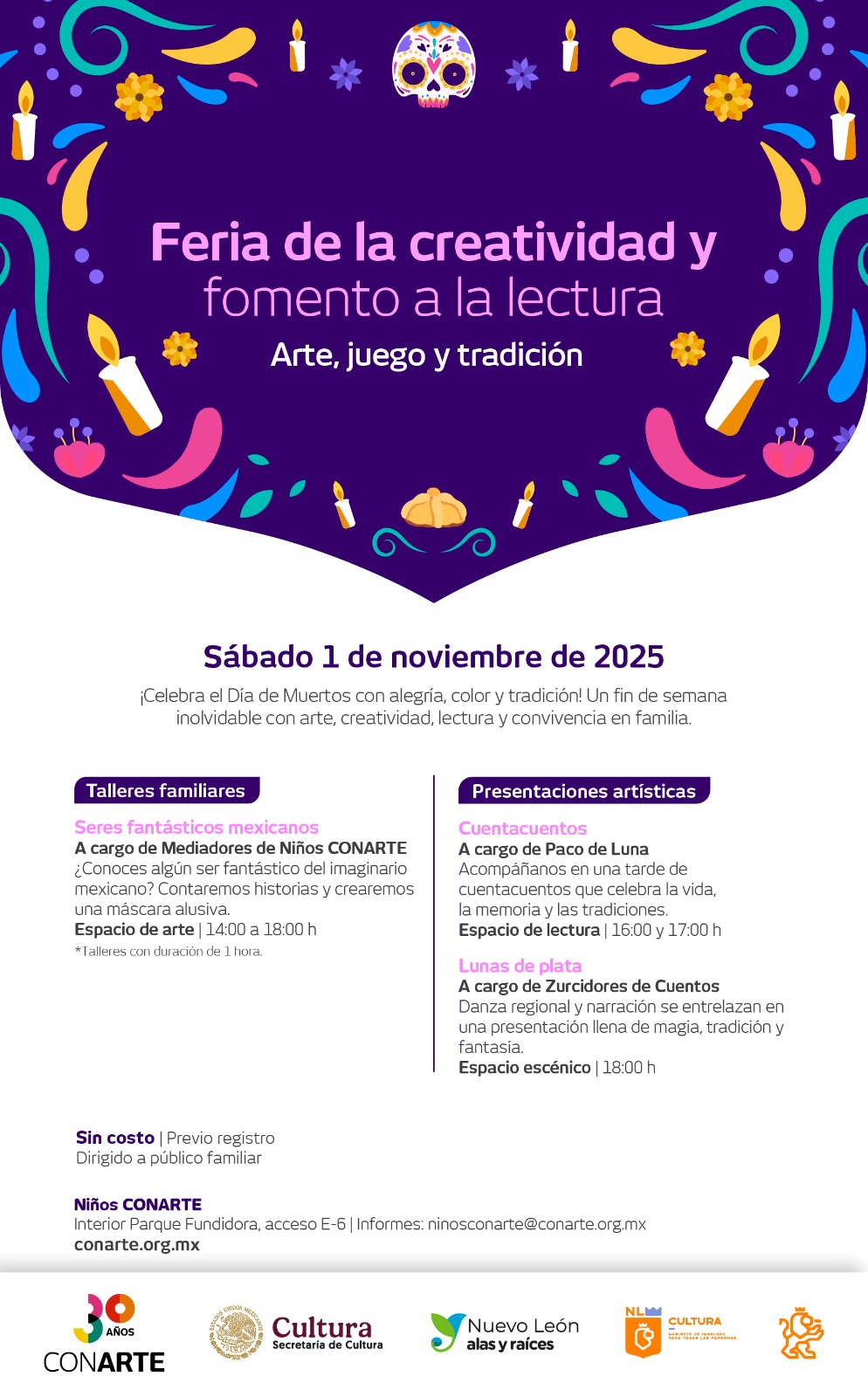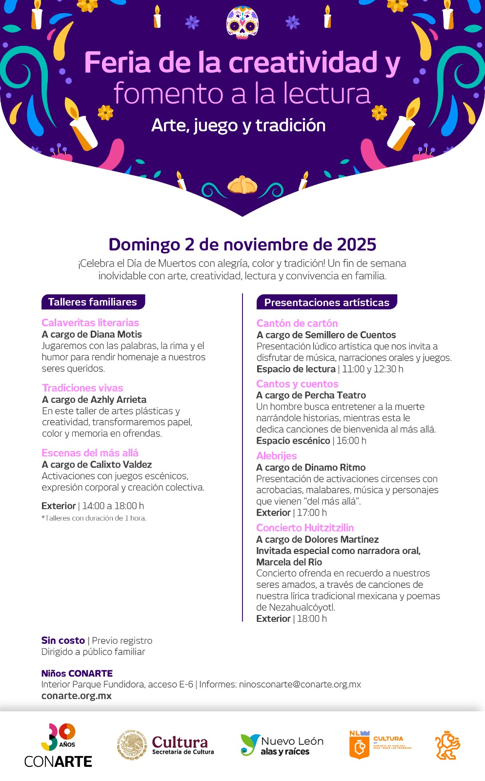 Monterrey, NL.- Con motivo del Día de Muertos, CONARTE ofrecerá este fin de semana un programa cultural y familiar que incluye talleres, presentaciones artísticas, cine y una exposición, en Niños CONARTE y el Centro de las Artes, ambos ubicados dentro del Parque Fundidora.