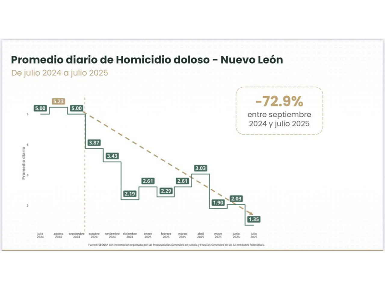 La cifra está calculada comparando el promedio diario de víctimas de homicidio doloso de julio de 2025, con el punto más alto registrado en este indicador, en septiembre de 2024.