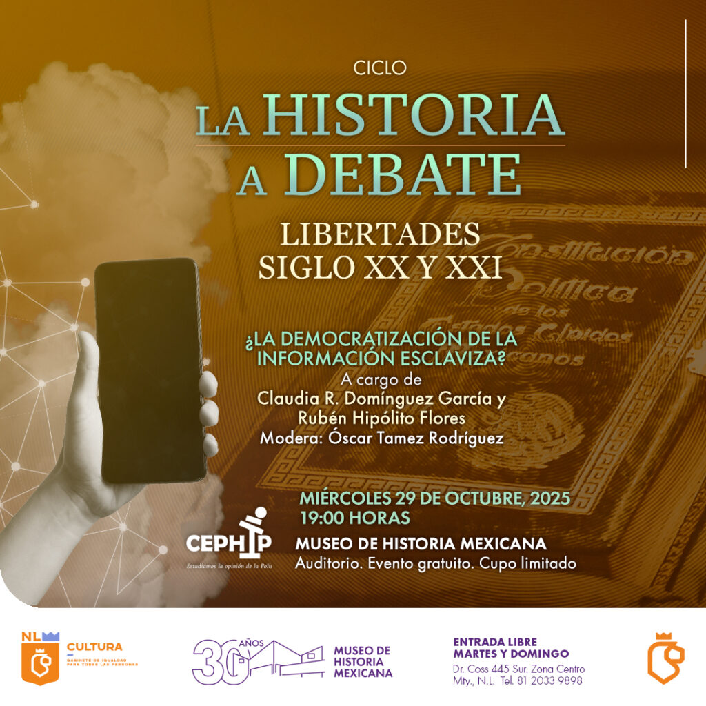 Nuevo León.- Las personas están sobreinformadas y al mismo tiempo desinformadas sobre cualquier tipo de tema; por ello hay que saber si “¿La democratización de la información esclaviza?” y asistir al ciclo “Historia a Debate – Libertades siglos XX y XXI”, el miércoles 29 de octubre a las 19:00 horas en el Museo de Historia Mexicana, donde los especialistas analizarán el tema.