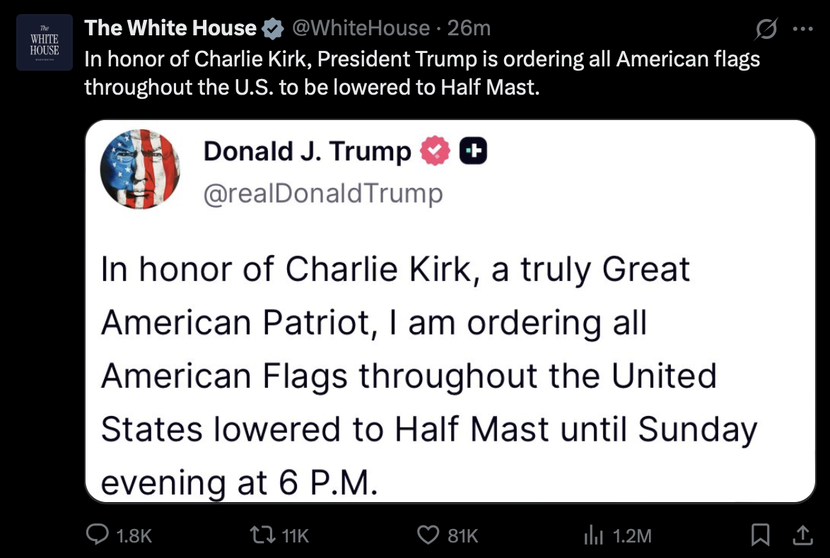 La cuenta de La Casa Blanca publicó que en honor a Kirk, Donald Trump, ordenó que todas las banderas en el país sean izadas a media asta.