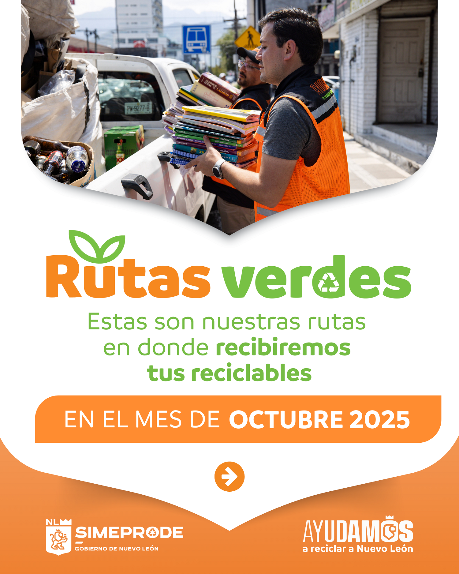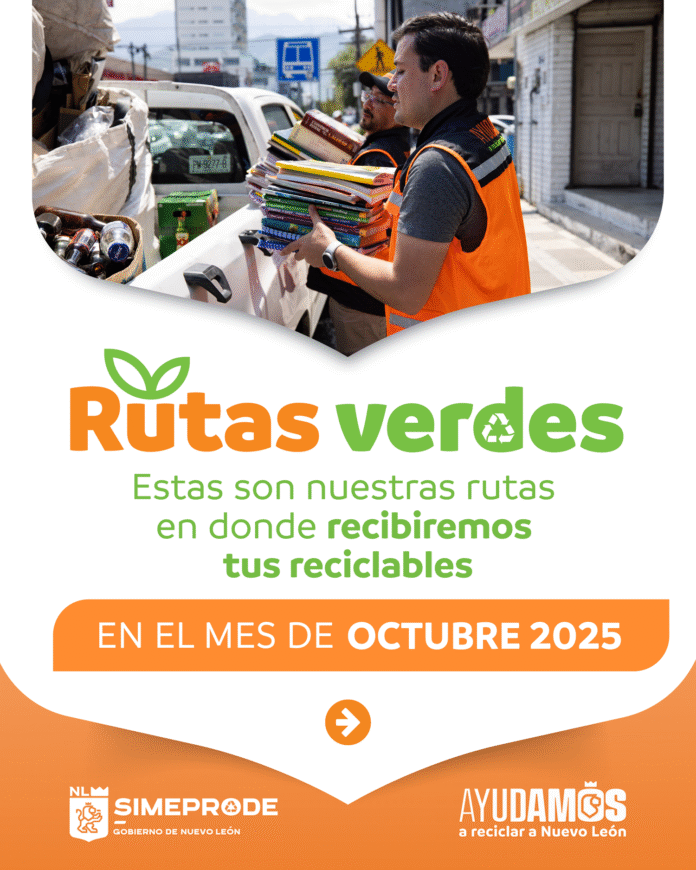 Nuevo León.- La División Ambiental impulsa acciones permanentes para cuidar y mejorar nuestro entorno. En este esfuerzo, SIMEPRODE, en coordinación con la Secretaría de Medio Ambiente, presenta el calendario de octubre del programa Rutas Verdes, que acerca a la ciudadanía puntos de acopio en distintas zonas del área metropolitana para la recepción de materiales reciclables.