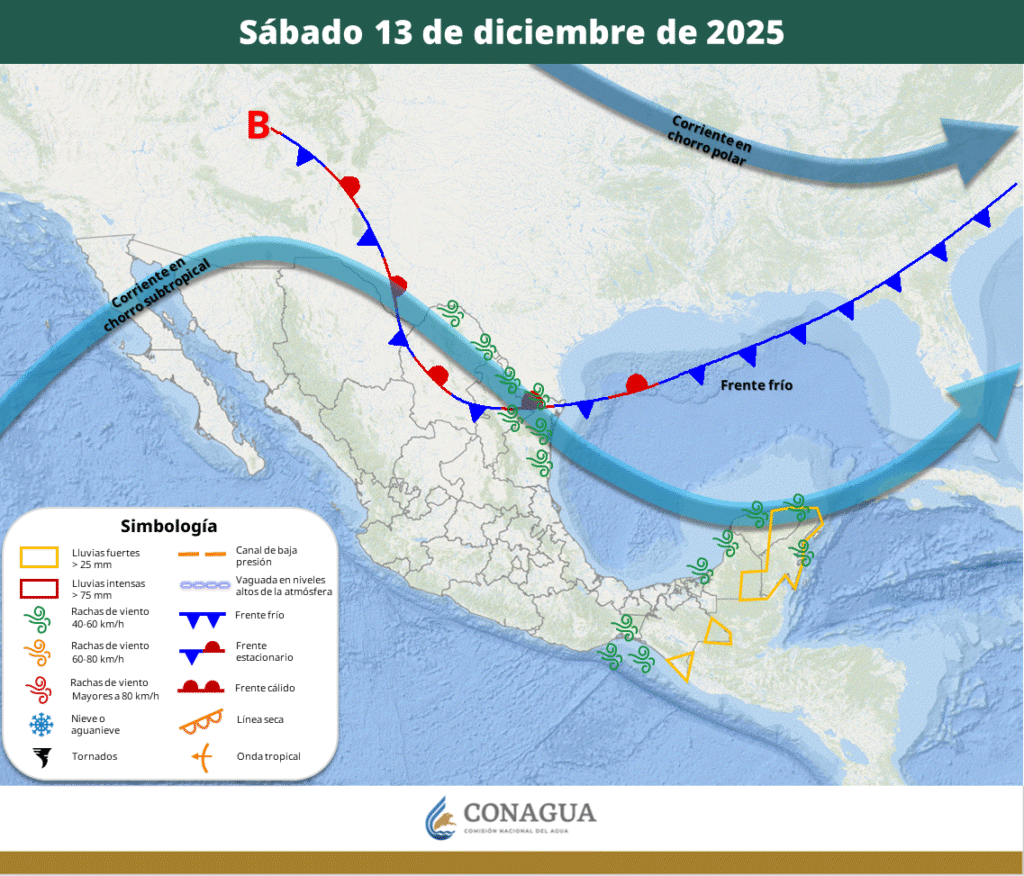 El sistema frontal viene acompañado de lluvias e intervalos de chubascos, así como de rachas de vientos de 40 a 60 km/h.