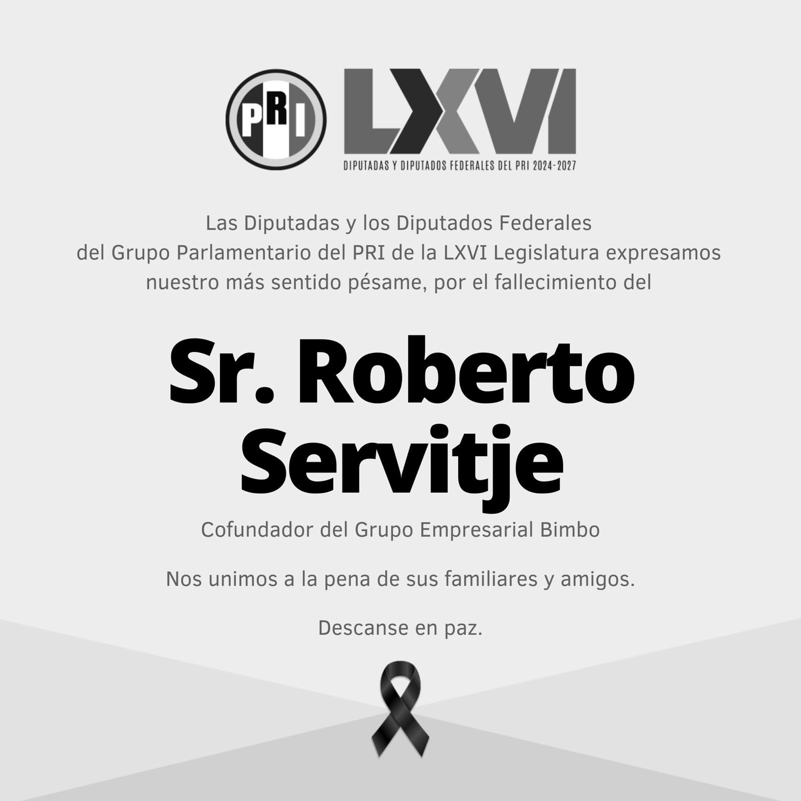 México.-Las y los diputados federales del PRI lamentamos profundamente el sensible fallecimiento del empresario y filántropo mexicano, Roberto Servitje Sendra.
