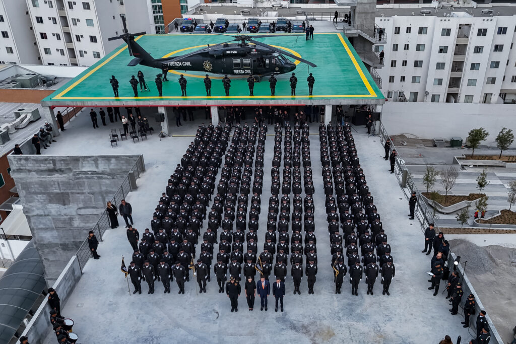 En el Cuartel General de la Nueva Fuerza Civil, que albergará a las instituciones de seguridad en el Estado, el Mandatario estatal, acompañado del Secretario General de Gobierno, Miguel Ángel Flores Serna; del titular de la nueva Fuerza Civil, Gerardo Escamilla, de  funcionarios federales, estatales, municipales, cámaras empresariales e integrantes de la Mesa de Seguridad, les dio la bienvenida a los graduandos a la mejor Policía de México.