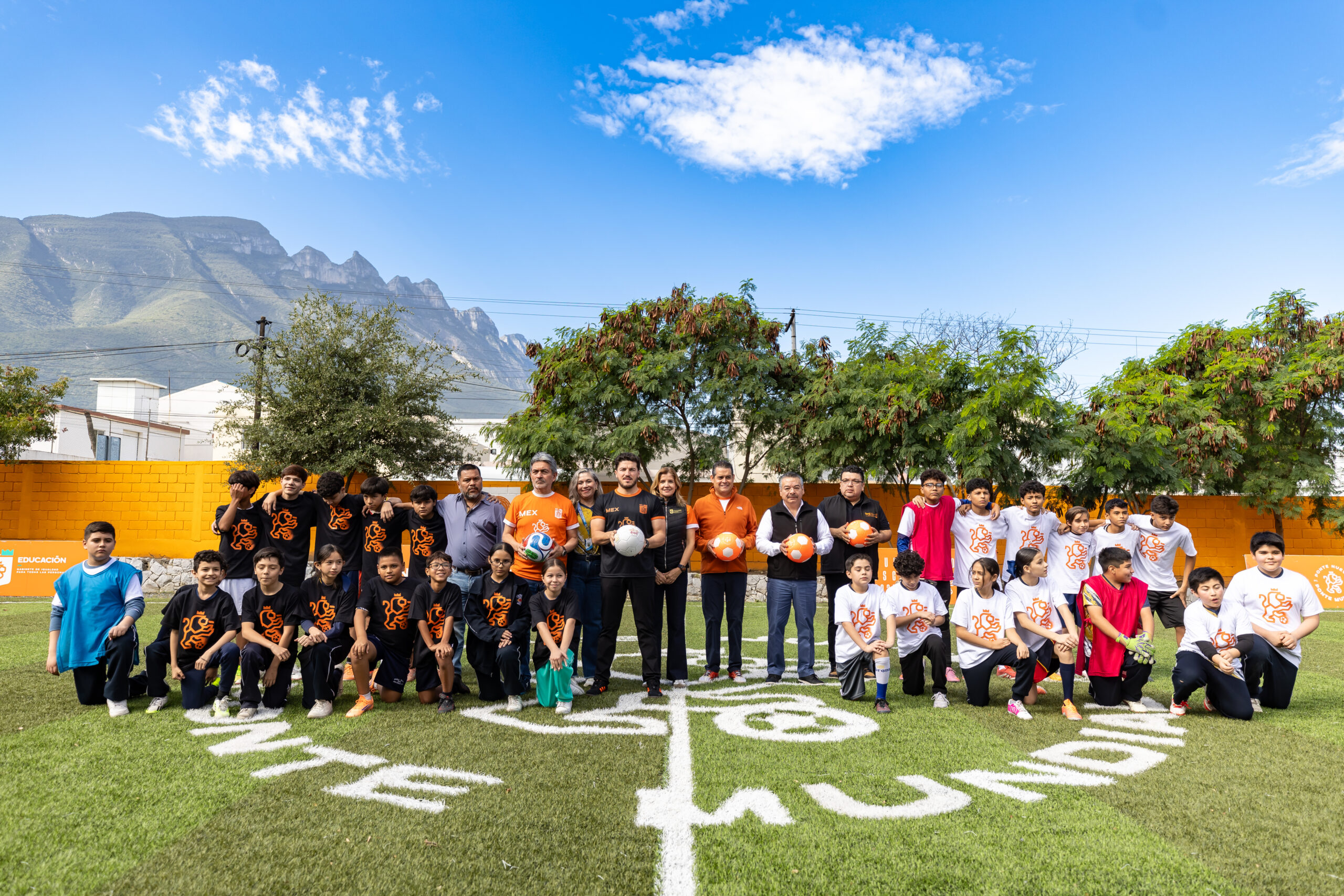 Monterrey, Nuevo León.– El Gobernador de Nuevo León, Samuel Alejandro García Sepúlveda, encabezó la entrega de una nueva cancha deportiva en la Escuela Primaria “Profr. Jesús Morelos Garza”, ubicada en la colonia Burócratas del Estado, al norte de Monterrey.