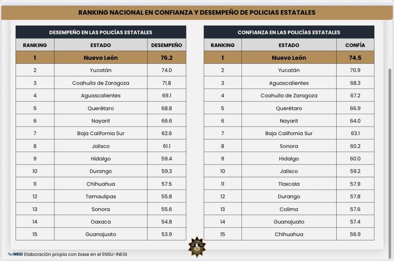 Un 76.2% de los nuevoleoneses encuestados considera que la Nueva Fuerza Civil está teniendo un buen desempeño, mientras que un 74.5% dijo tener confianza en la corporación estatal, ambas cifras las más altas del país.
