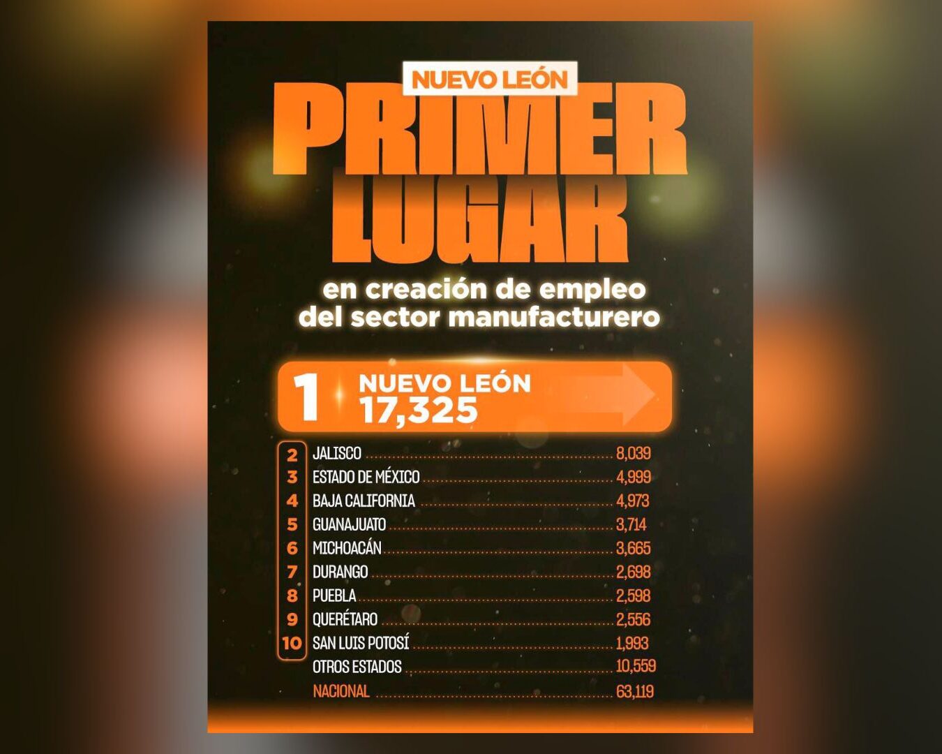 Nuevo León.- Durante el primer trimestre de 2026, Nuevo León se posicionó como el primer lugar nacional en creación de empleo en el sector manufacturero al generar 17,325 nuevos puestos de trabajo, de acuerdo con cifras del IMSS.