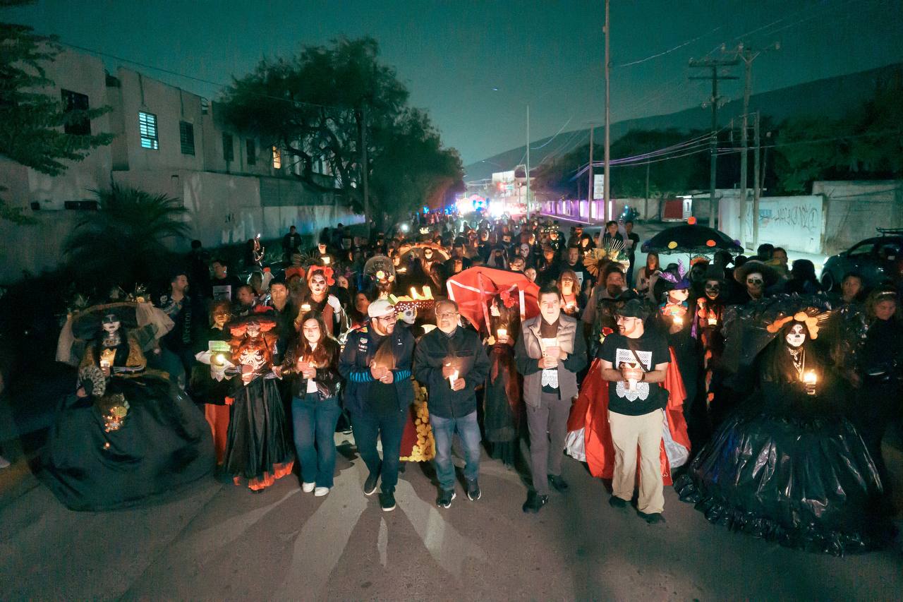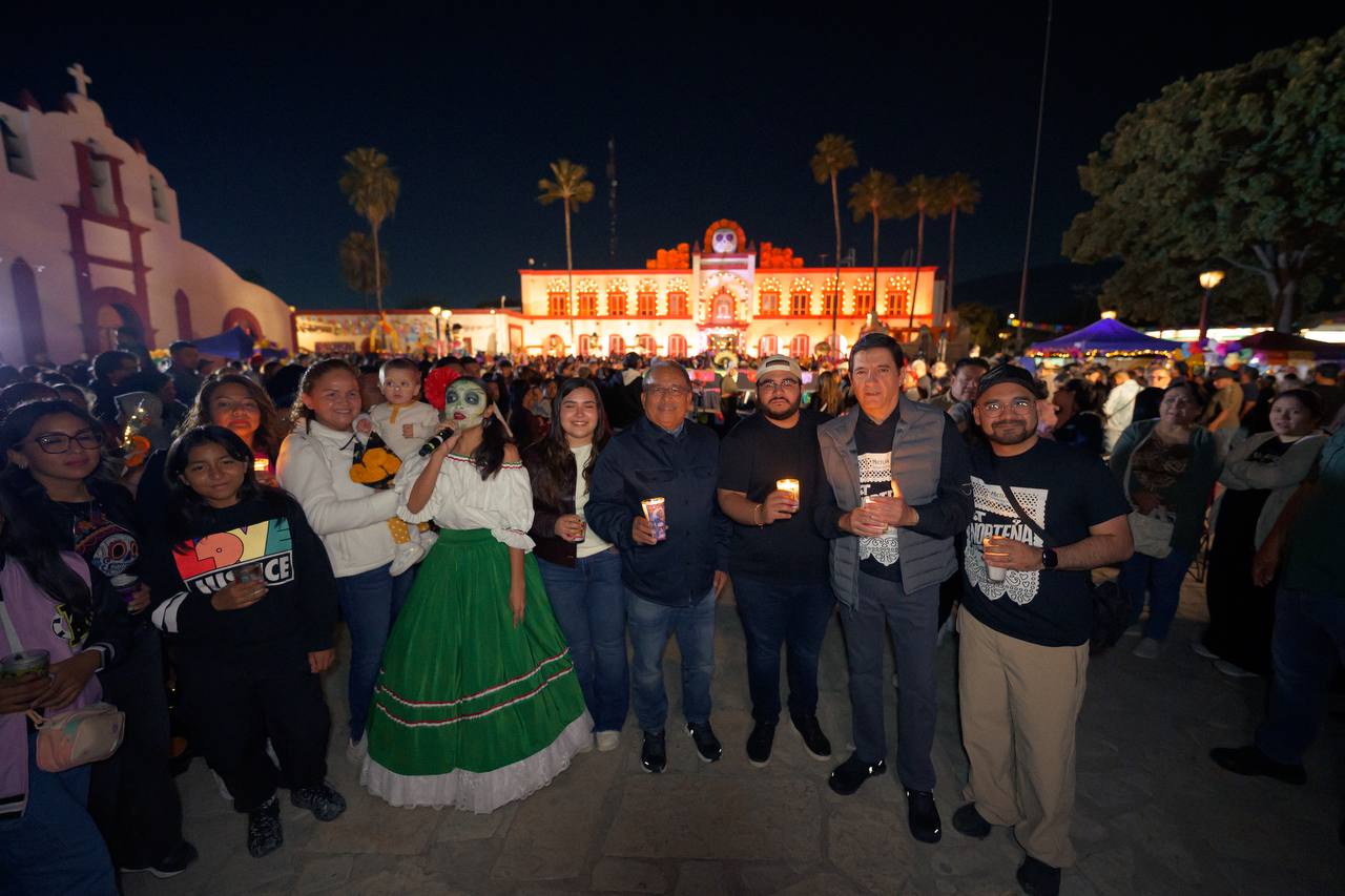 Durante el trayecto, el desfile hizo una pausa simbólica en el Panteón Jardín del Edén, donde el alcalde Andrés Mijes, acompañado de su familia y del secretario del Ayuntamiento, Felipe Canales, encabezó una procesión iluminada por decenas de velas, como muestra de amor y recuerdo hacia los seres queridos.