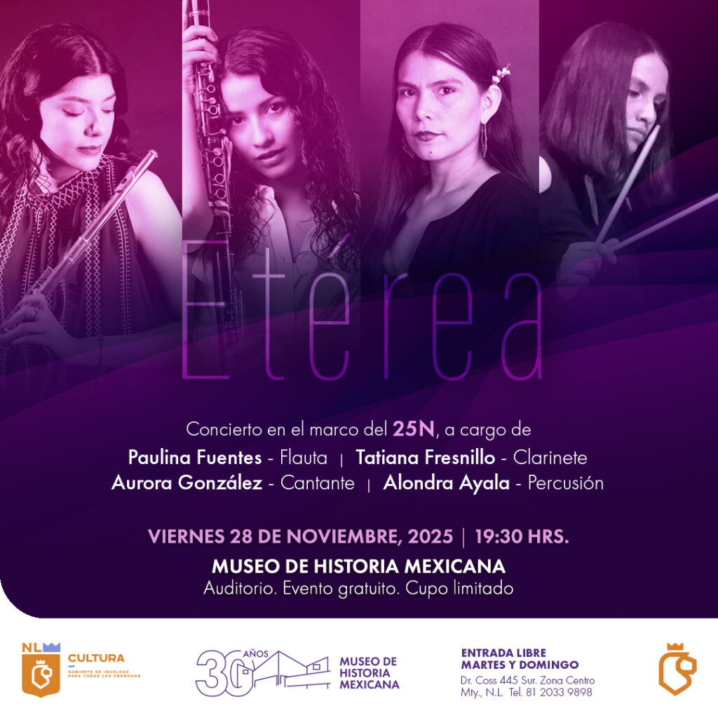 Nuevo León.- El Museo de Historia Mexicana presentará el concierto “Etérea”, una propuesta que conmemora el Día Internacional de la Eliminación de la Violencia contra la Mujer y que subraya el poder de la música para denunciar, sanar y transformar. La presentación se realizará el viernes 28 de noviembre, a las 19:30 horas, en el auditorio del museo.
