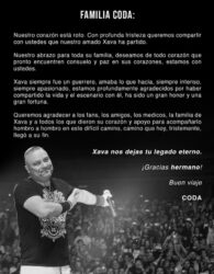 “Xava siempre fue un guerrero, amaba lo que hacía, siempre intenso, siempre apasionado, estamos profundamente agradecidos por haber compartido la vida y el escenario con él, ha sido un gran honor y una gran fortuna. Queremos agradecer a los fans, amigos, medios, familia de Xava y todos los que dieron su corazón y apoyo para acompañarlo hombro a hombro en este difícil camino, camino que hoy tristemente llegó a su fin”, concluye.