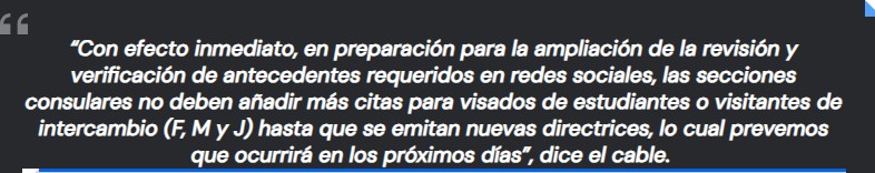 Para aplicar un control más estricto de los perfiles en redes sociales de los extranjeros que pretenden estudiar en los Estados Unidos, este martes el Secretario de Estado, Marco Rubio, ordenó a las embajadas estadounidenses en todo el mundo que dejen de programar nuevas entrevistas.