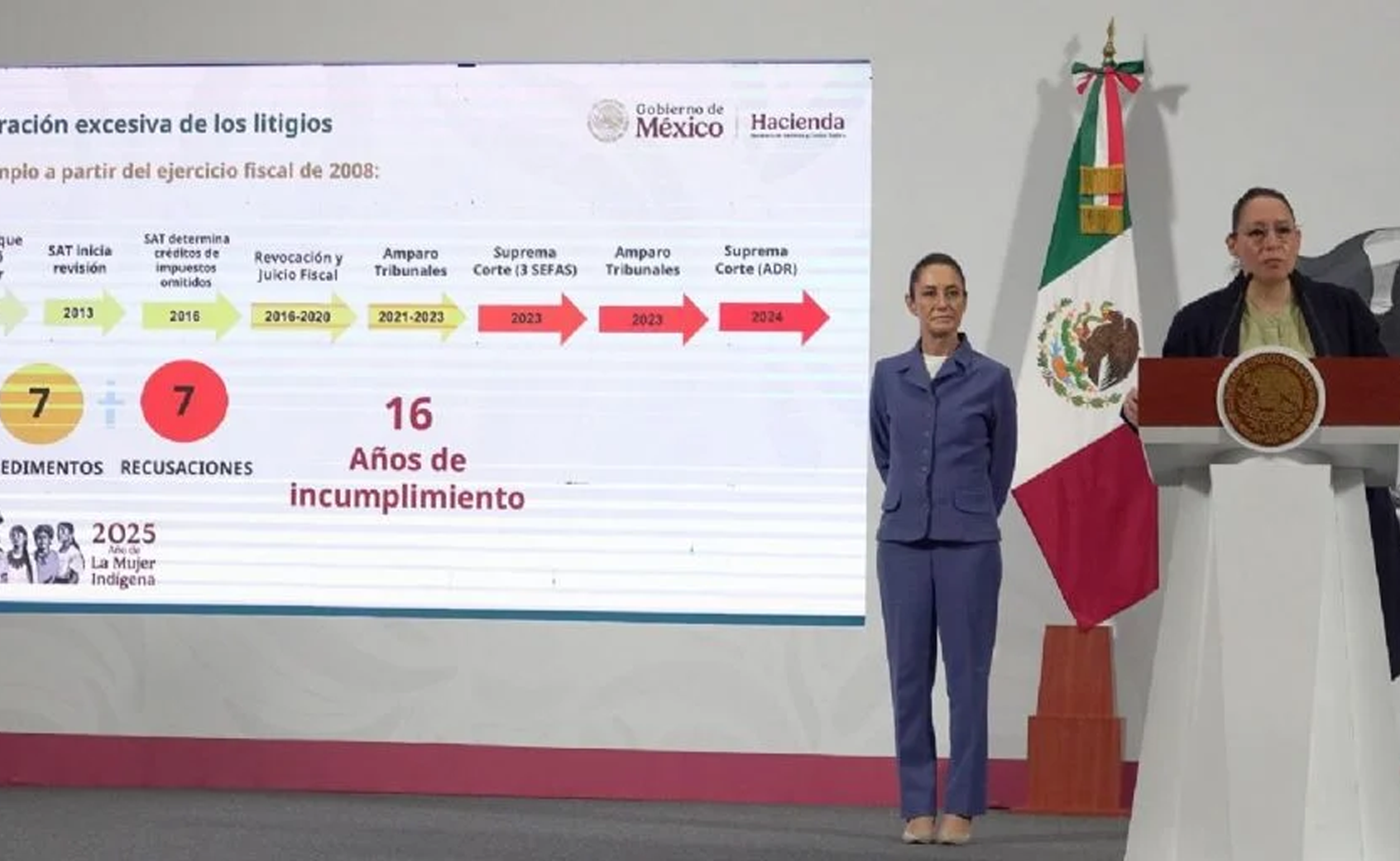 La funcionaria afirmó que este litigio se encuentra en la Suprema Corte de Justicia, Tribunales Colegiados, Juzgados de Distrito y el Tribunal Federal de Justicia Administrativa, y sugirió que algunos fallos habrían sido deliberadamente demorados.