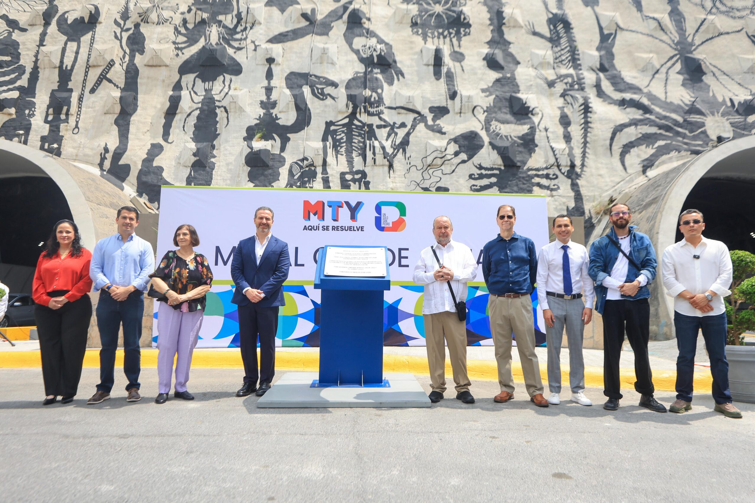 Durante la ceremonia estuvieron presentes autoridades de ambos municipios, como Marcelo Segovia, secretario de Administración de Monterrey; Mayela Quiroga, secretaria de Servicios Públicos; Luis Susarrey Flores, secretario general del Ayuntamiento de San Pedro; Agustín Basave Benítez, así como los artistas creadores del mural.
