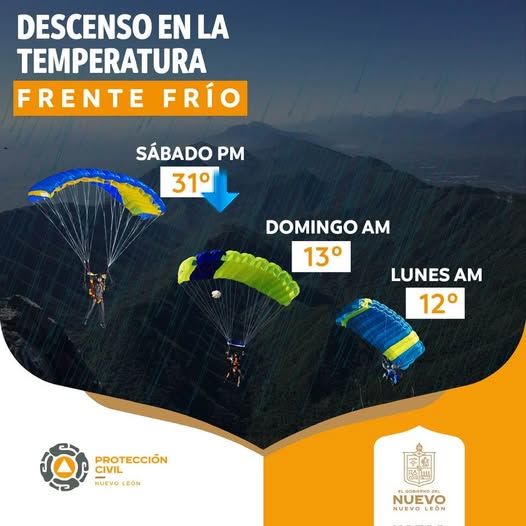 Nuevo León.- Protección Civil Nuevo León informa que el ingreso de un nuevo Frente Frío y su masa de aire fría reforzado con una vaguada en niveles medios y altos de la atmósfera, estará provocando un marcado descenso de temperatura, así como condiciones inestables en el estado.