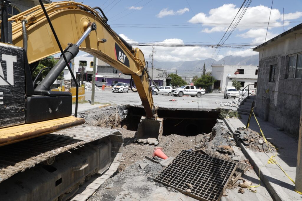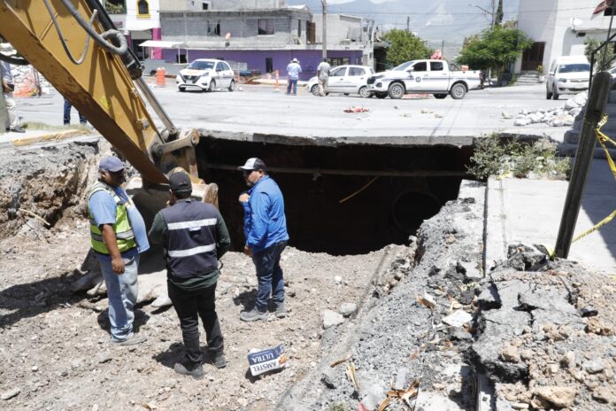 Escobedo, Nuevo León.- Ante un peligro inminente para la población, el Municipio de Escobedo tomó la decisión de iniciar los trabajos de reparación del socavón formado en el cruce de las calles Santiago Roel y San Jacinto, en la Colonia Santa Lucía.