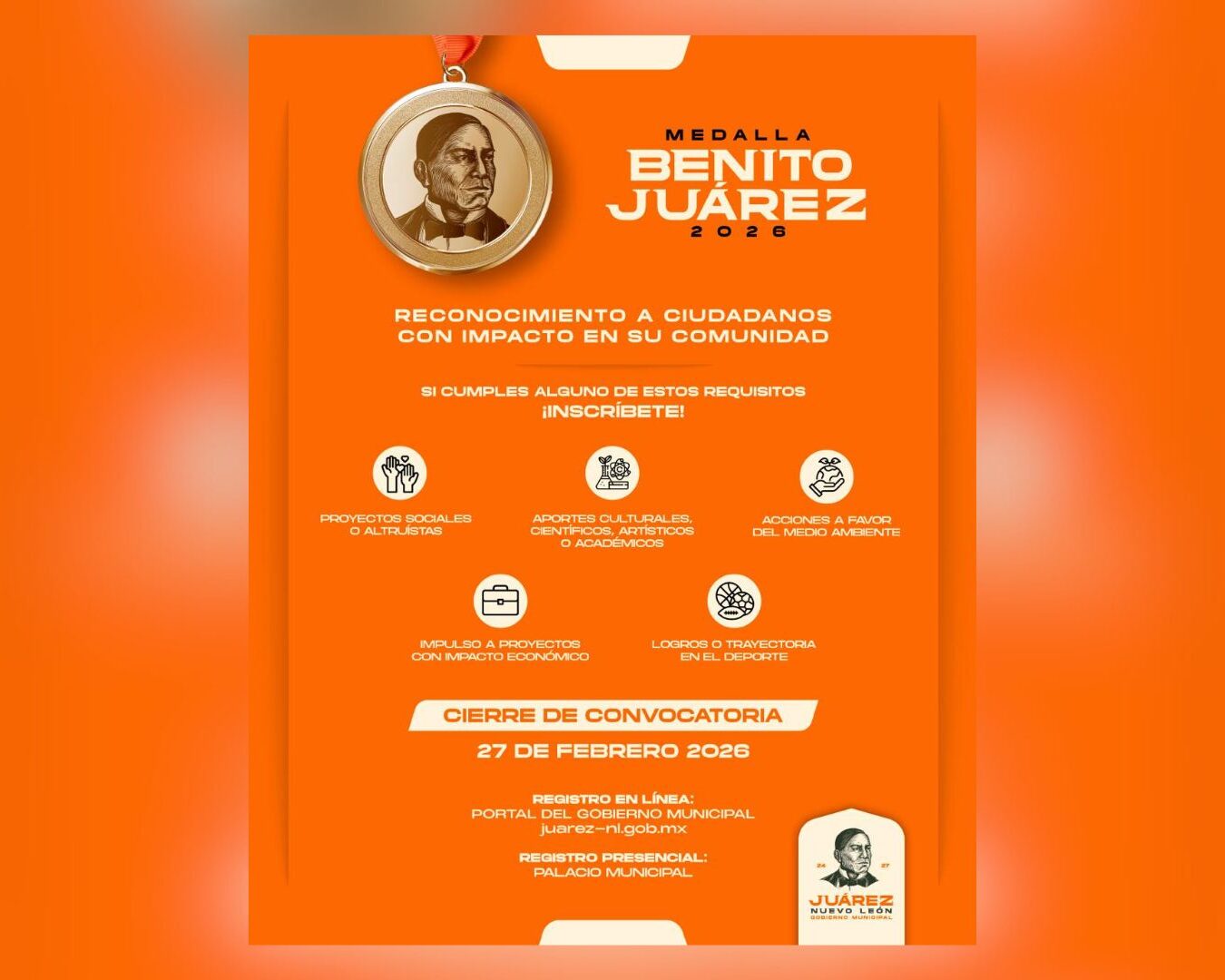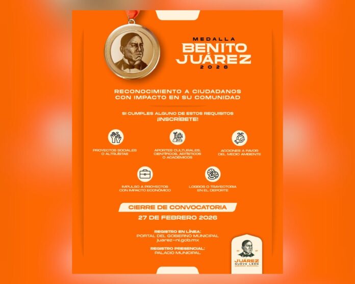 Juárez, Nuevo León.- Con la finalidad de reconocer la labor trascendental de juarenses ejemplares que, a través de sus aportaciones, contribuyen al desarrollo y prestigio del municipio, el Gobierno Municipal de Juárez, encabezado por el alcalde Félix Arratia Cruz, convoca a la ciudadanía a postular candidaturas para la Medalla Benito Juárez, Benemérito de las Américas, en su edición 2026.