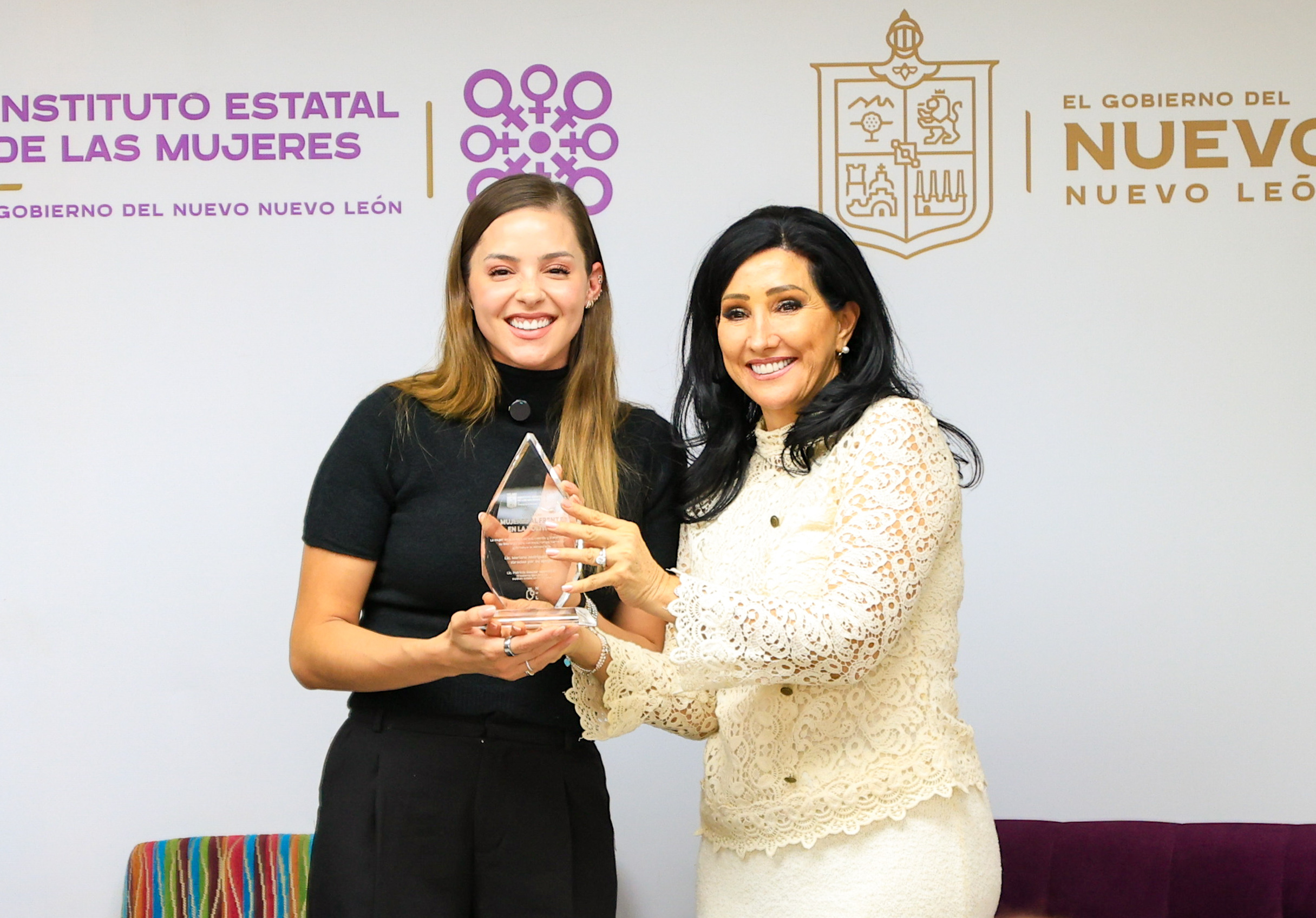 Al terminar el evento Mariana Rodríguez Cantú recibió un reconocimiento por parte de la Presidenta Ejecutiva del Instituto Estatal de las Mujeres, Patricia Salazar.