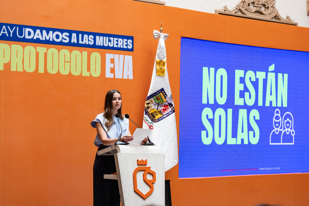 Mariana Rodríguez Cantú resaltó que en Nuevo Nuevo León, las mujeres son prioridad y explicó en que consiste el Protocolo EVA, en el cual se capacitará a personal de establecimientos como antros y centros nocturnos; restaurantes; bares; museos; casinos; centros de entretenimiento; estadios; centros comerciales; y hoteles para que sepan cómo actuar cuando una mujer se sienta en riesgo.