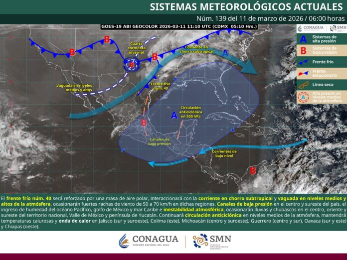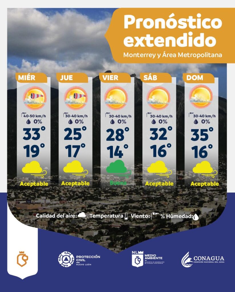 Nuevo León.-Protección Civil de Nuevo León informa que el Frente Frío núm. 40 se estará desplazando sobre el estado, favoreciendo un ambiente cálido a caluroso, así como rachas de viento fuertes. Debido a las condiciones atmosféricas presentes, la probabilidad de lluvia se mantiene baja.