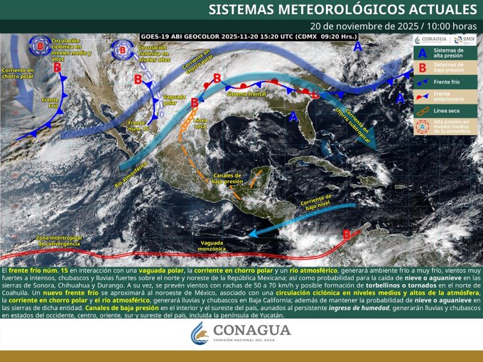 Nuevo León.- El frente frío número 15 de desplaza por el norte y noreste del país junto con una vaguada polar, la corriente en chorro y un río atmosférico, provocando un ambiente frío a muy frío y en algunos estados.