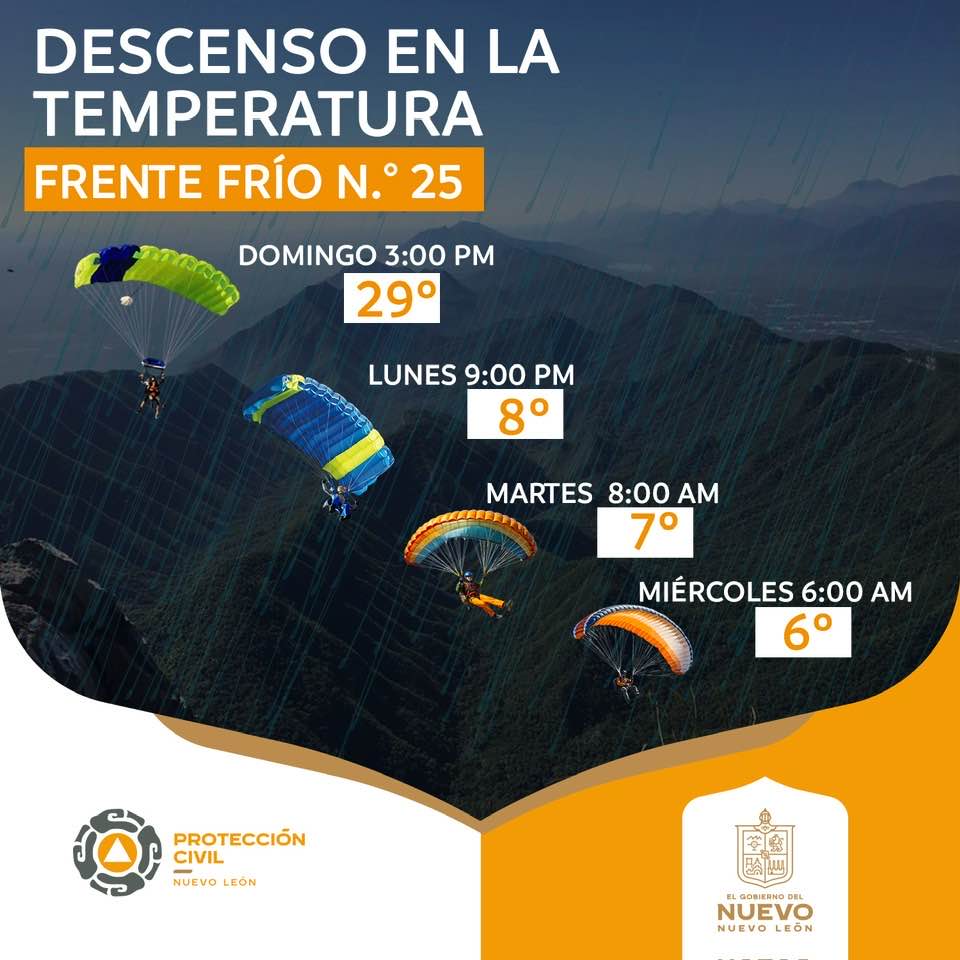 Nuevo León.-Protección Civil Nuevo León informa que este lunes 29 de diciembre, el ingreso del Frente Frío Núm. 25 impulsado por una masa de aire frío de origen ártico, generará ráfagas de viento muy fuertes, así como un marcado descenso de temperatura en el estado y lluvias moderadas a fuertes durante la mañana del día lunes.