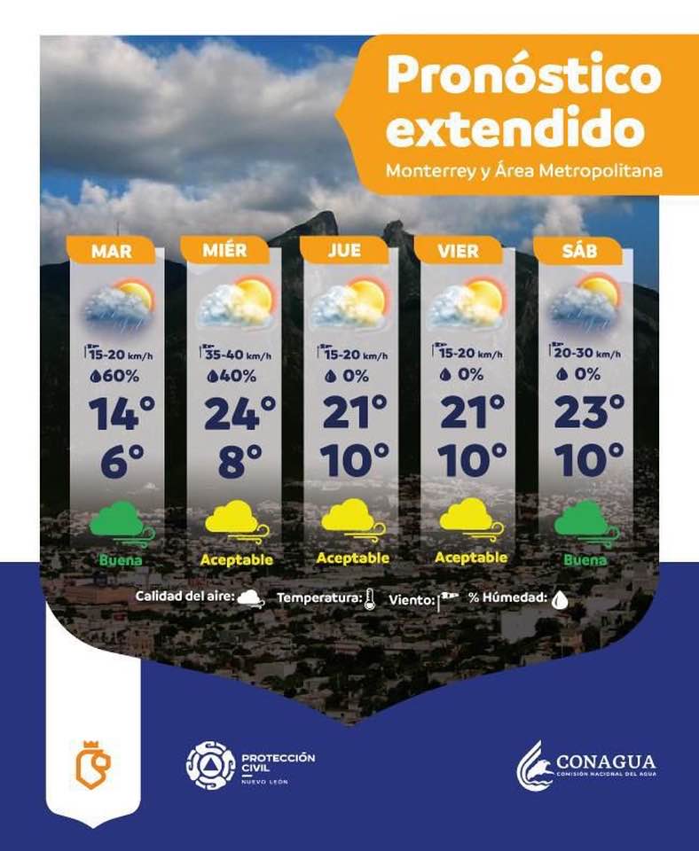 Para Nuevo Léon las temperaturas máximas para el miércoles14 de enero son de 24 grados y la mínima de 8 grados.