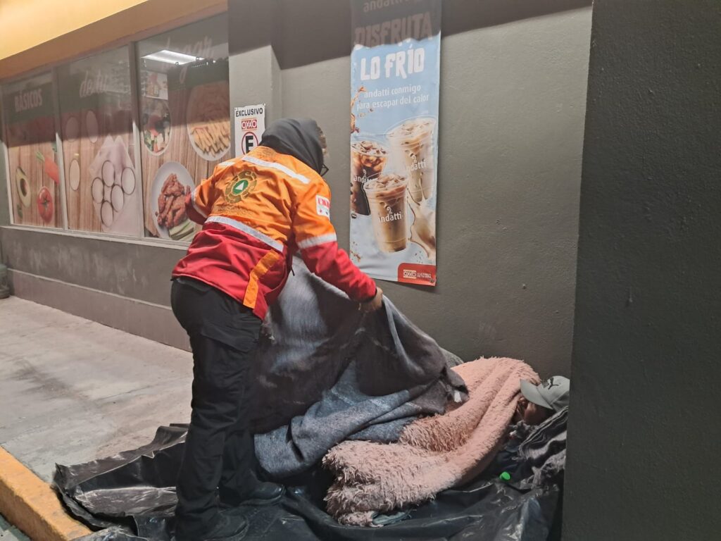 Los elementos auxiliaron a personas en situación de calle a quienes entregaron cobertores, pan y chocolate para mitigar las bajas temperaturas.