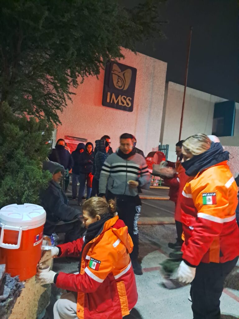 Los elementos de Protección Civil de Escobedo también acudieron a la Clínica 43 del IMSS, donde además de bebida calientes y pan, entregaron cobertores a las personas que acuden a consulta.