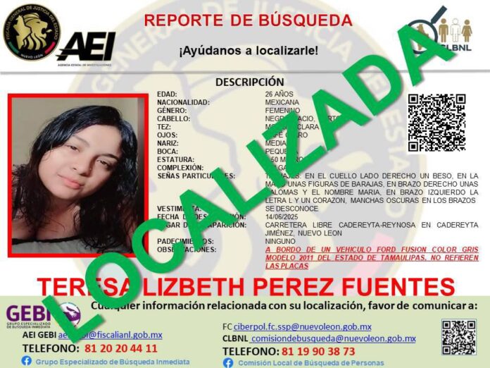 La localización tuvo lugar a las 5:26 horas de este viernes, participando efectivos de Fuerza Civil, apoyados por la Guardia Nacional, la Defensa, la Secretaría de Seguridad y Protección Ciudadana, la Fiscalía de Nuevo León y la Fiscalía Especializada Antisecuestros.