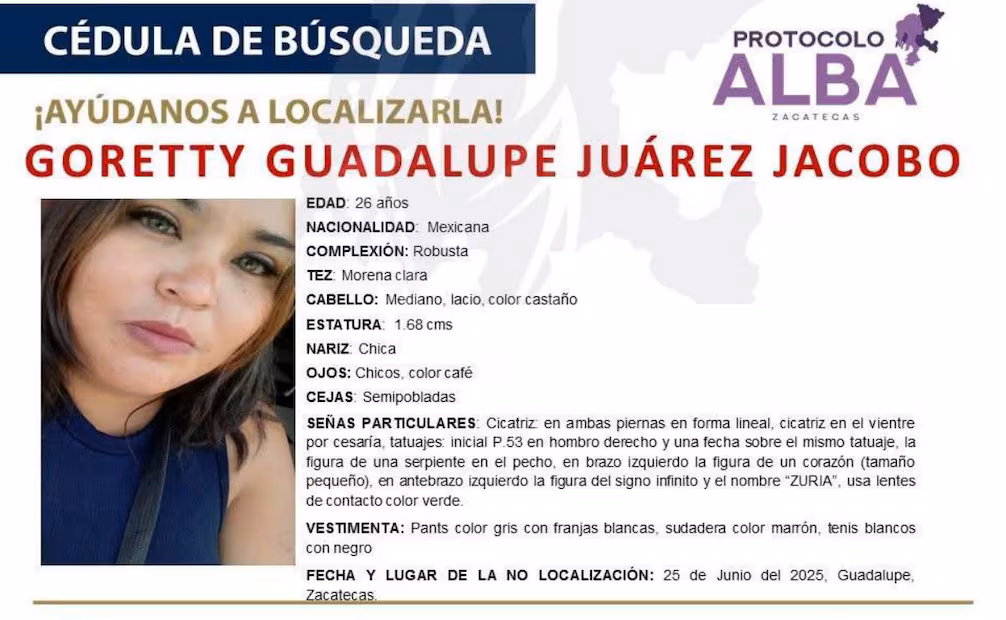 Zacatecas, Zac.- Autoridades estatales confirmaron este jueves el hallazgo sin vida de Aida Karina Juárez Jacobo, madre buscadora que fue privada de la libertad el pasado martes en Guadalupe, Zacatecas, y quien desde junio buscaba a su hija Goretty, reportada como desaparecida.