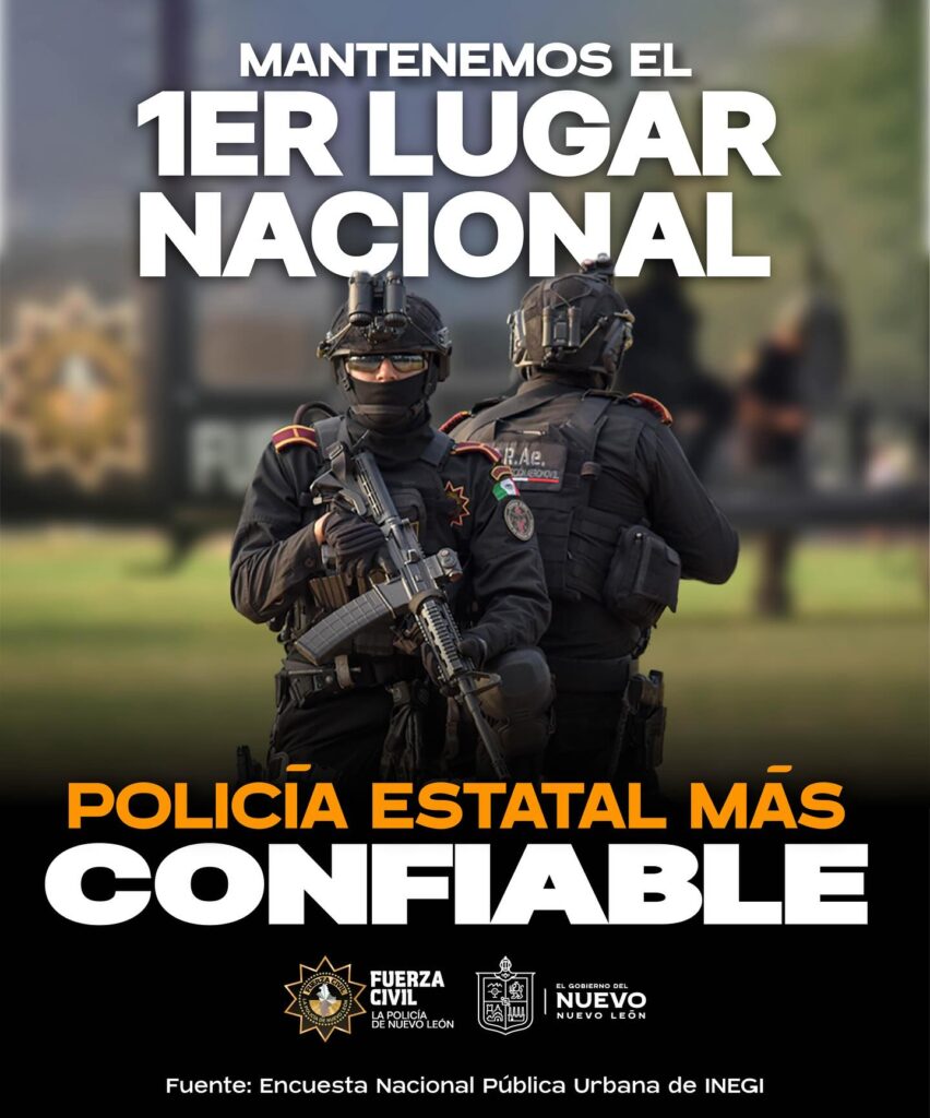 Nuevo León.- La institución policial Fuerza Civil mantuvo por segundo trimestre consecutivo el primer lugar nacional como la policía estatal mejor evaluada en confianza y percepción de desempeño, según la Encuesta Nacional de Seguridad Pública Urbana (ENSU) de INEGI.