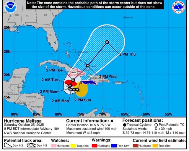 Melissa se encontraba la noche del sábado 25 de octubre a 200 kilómetros al sur-sureste de Kington, Jamaica y ha 455 kilómetros al oeste-suroeste de Puerto Príncipe, Haití, tiene con vientos máximos sostenidos de 185 km/h, se desplaza lentamente hacia el oeste a una velocidad de 6 km/h, información proporcionada por el Centro Nacional de Huracanes de Estados Unidos con sede en Miami.