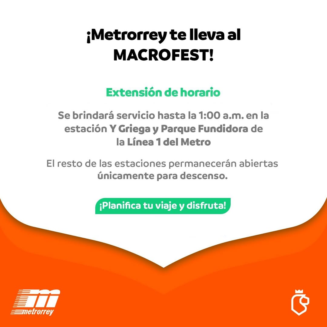 El Sistema de Transporte Colectivo Metrorrey anunció la ampliación de su horario de operación con motivo del Macro Fest, evento que se realizará este domingo 23 de noviembre en el Campo de Béisbol Acero del Parque Fundidora, en Monterrey.