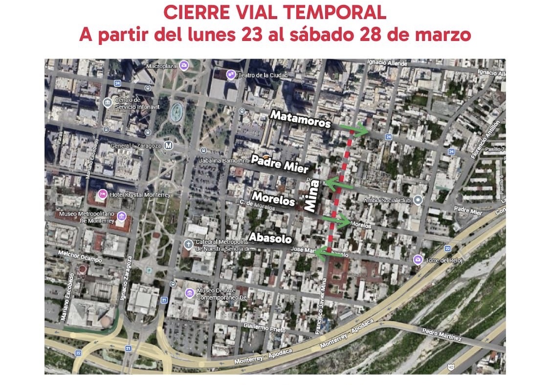 El municipio de Monterrey anunció el cierre parcial de la calle Francisco Javier Mina, en el tramo comprendido entre Matamoros y Abasolo, como parte de los trabajos de rehabilitación en el Barrio Antiguo.
